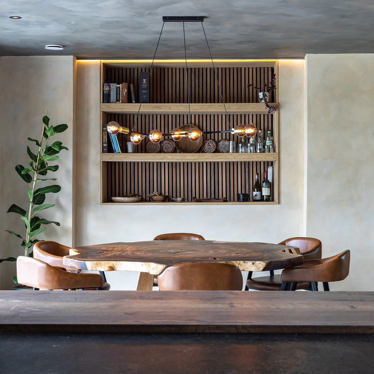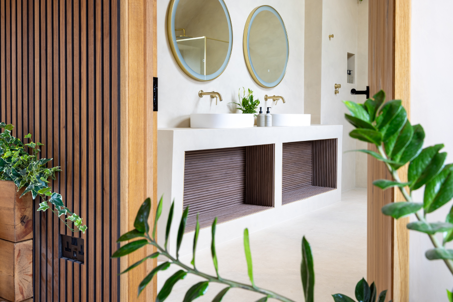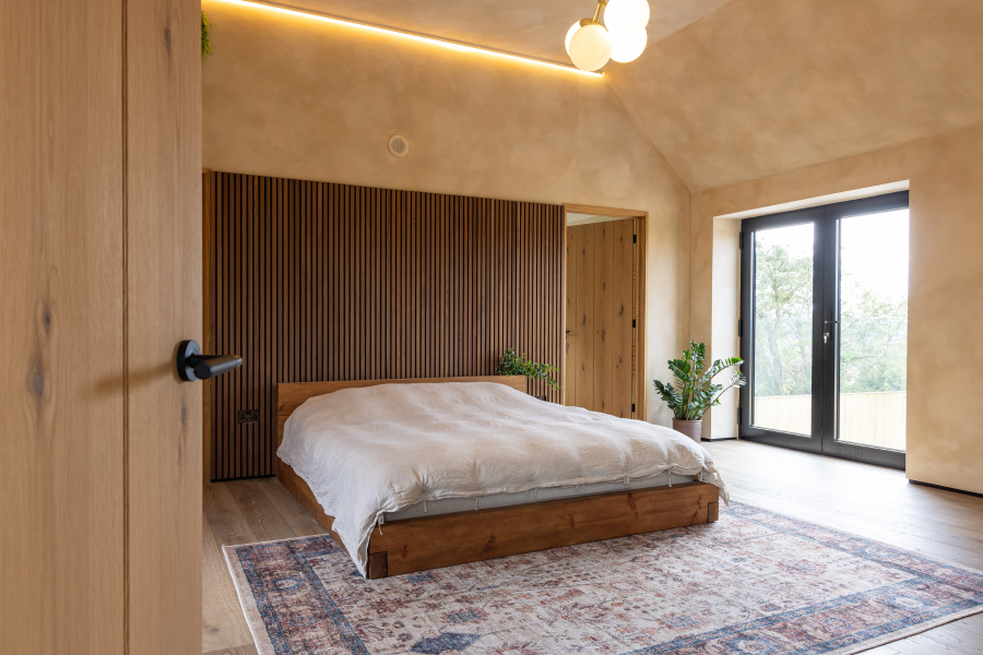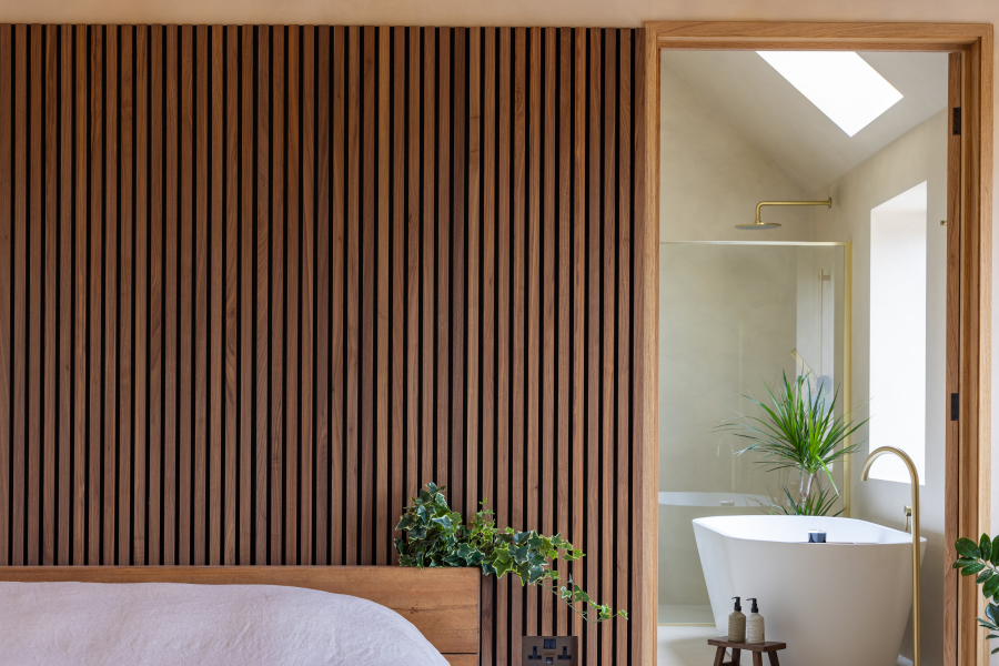 The master bedroom is Giuliano and Zara's personal sanctuary. They wanted this space to be luxurious and comforting, while the second bedroom needed to feel equally inviting for guests. They chose SlatWall American Walnut for the master bedroom, its rich, dark tones created an intimate, cosy atmosphere, perfect for unwinding at the end of the day. In the second bedroom, they opted for the classic SlatWall American Walnut, maintaining a similar aesthetic but with slightly lighter hues that create a more open feel. The subtle difference between the Deep Walnut and Walnut panels allowed them to establish distinct yet connected atmospheres across these rooms.