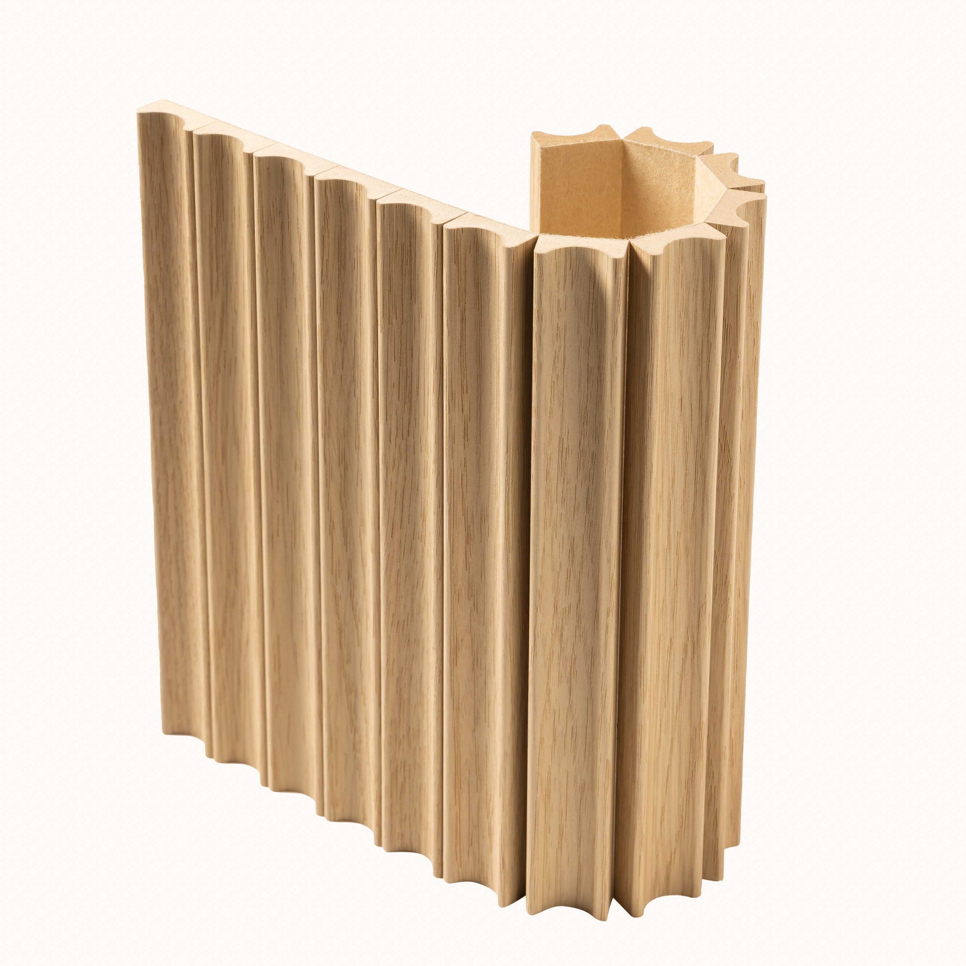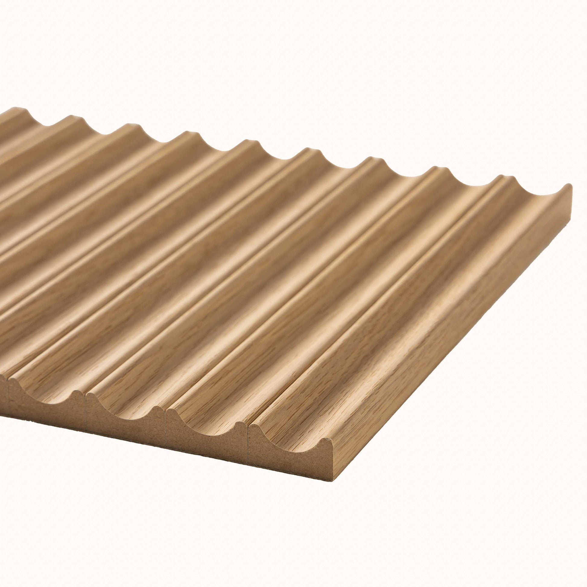Gently curved fluted profiles introduce depth and movement, offering a refined take on vertical panelling. Inspired by classic tambour panelling Fluted is available in Light Oak and Deep Walnut, it suits both modern feature walls and softly layered interiors.