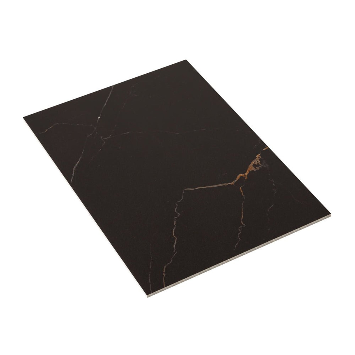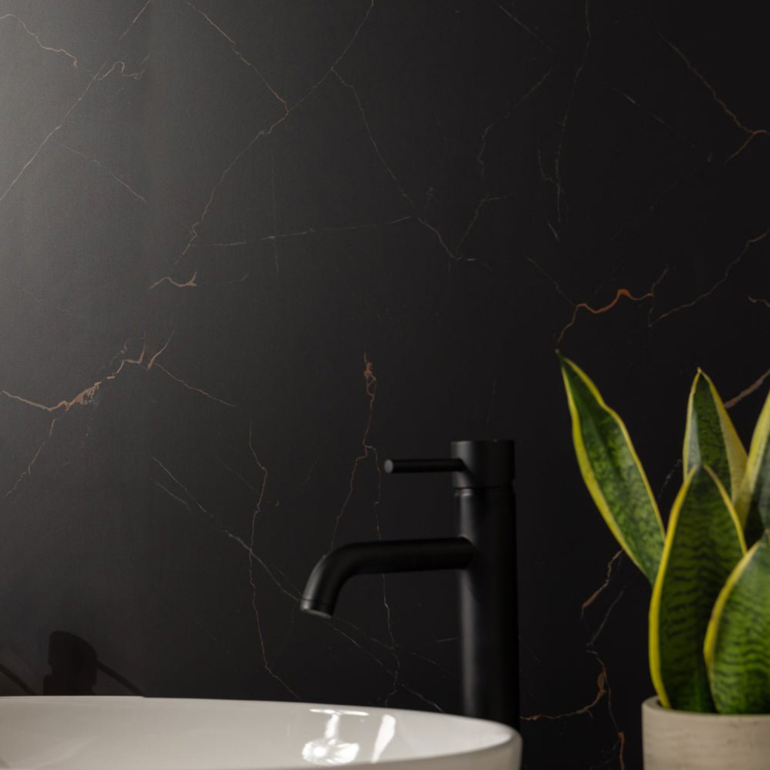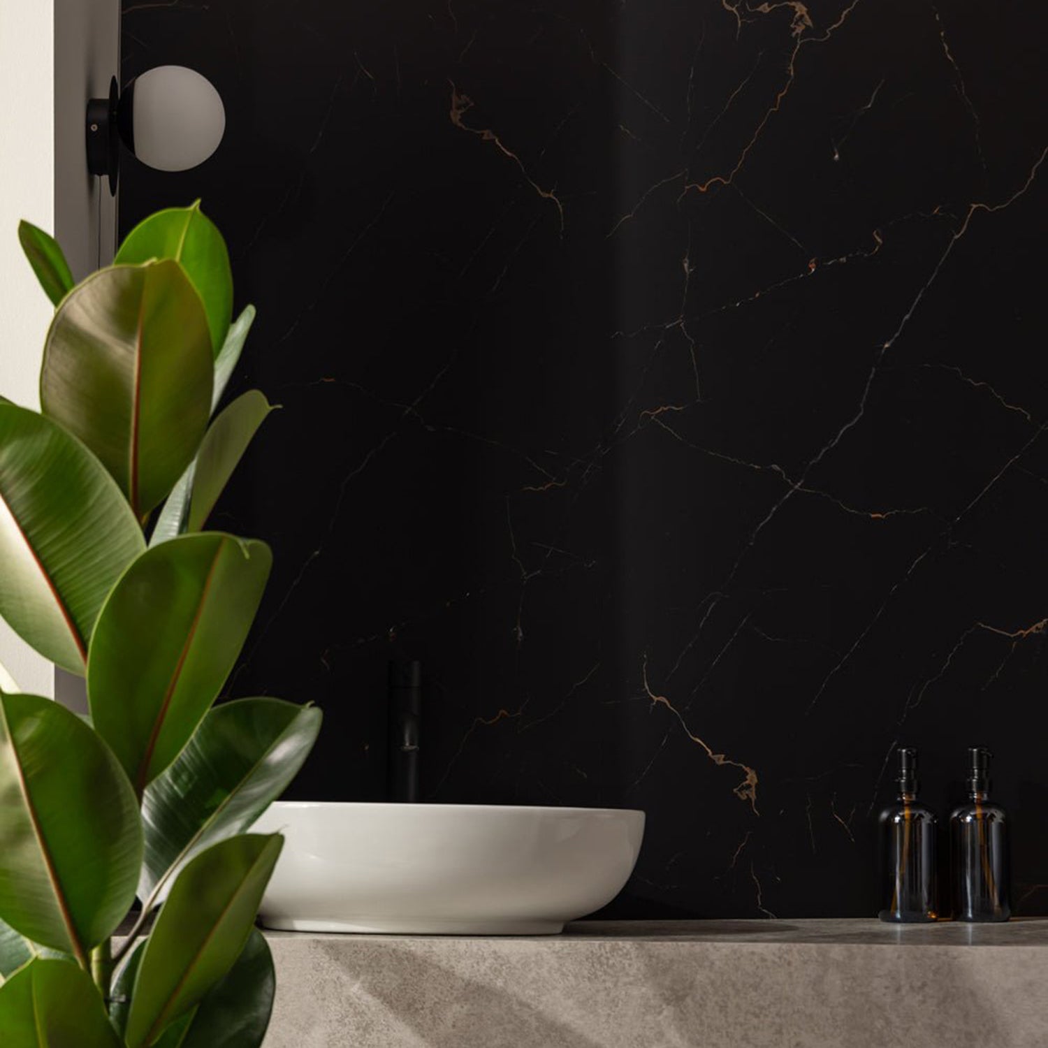 Preview the dramatic luxury of Elemence Marquina Black with this sample. Deep black tones with striking gold veining make this sample perfect for experiencing the bold, elegant marble effect it brings to bathrooms and kitchens.