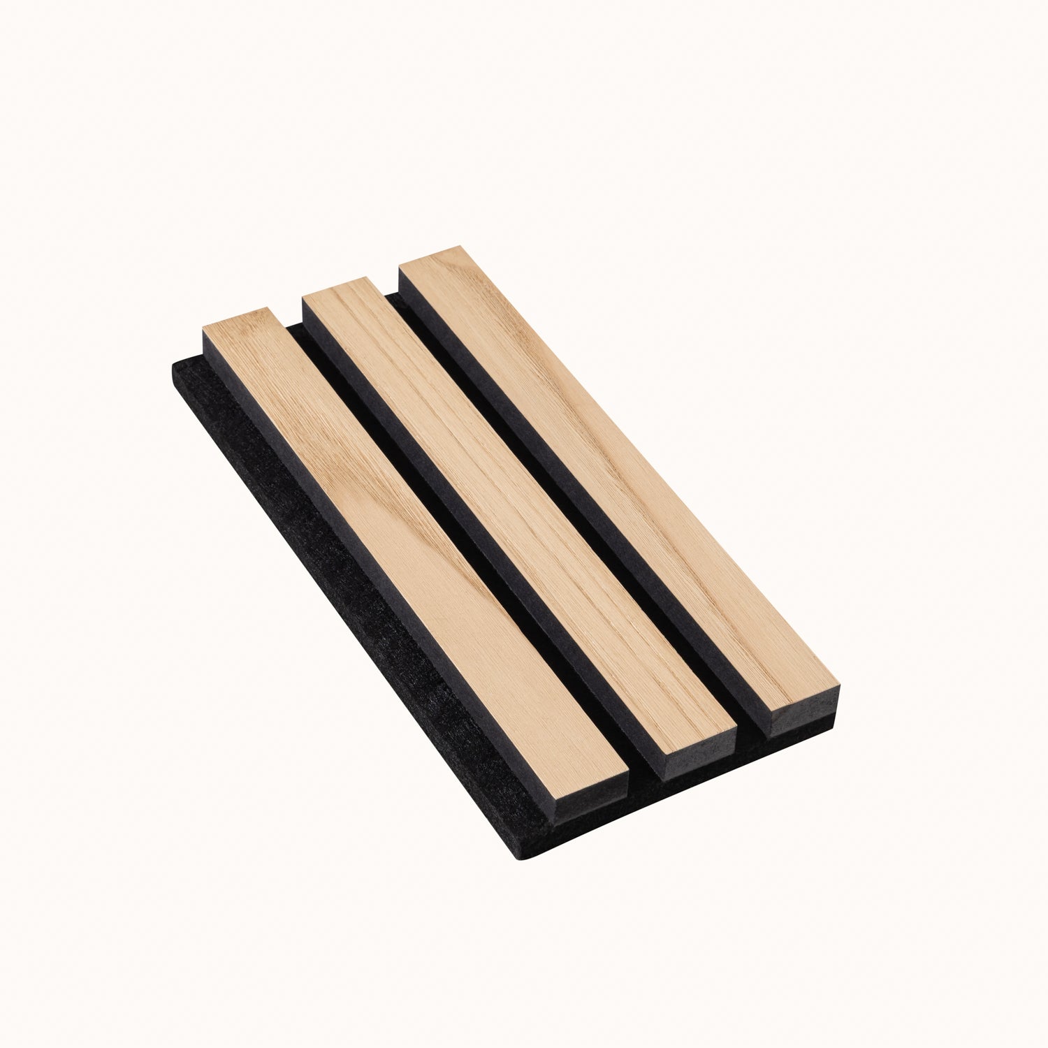 Acoustic Benefits: This SlatWall Acoustic sample is crafted by us at our Yorkshire workshop, ensuring a high-quality finish beyond compare. Each sample is assembled from MDF slats topped with a premium wood veneer, bonded to recycled felt with extra-strong adhesive. Our felt backing features acoustic properties and helps to reduce noise, enhancing your interior's acoustics.