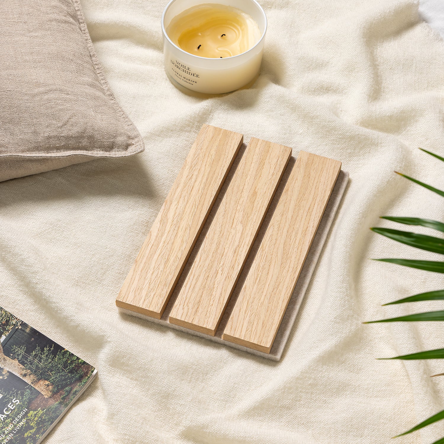 Made in Britain: This SlatWall Acoustic panel is crafted by us at our Yorkshire workshop, ensuring a high-quality finish beyond compare. Each panel is assembled from MDF slats topped with a premium wood veneer, bonded to recycled felt with extra-strong adhesive - no staples. Our recycled felt backing features acoustic properties helping to reduce noise, enhancing your interior's acoustics.