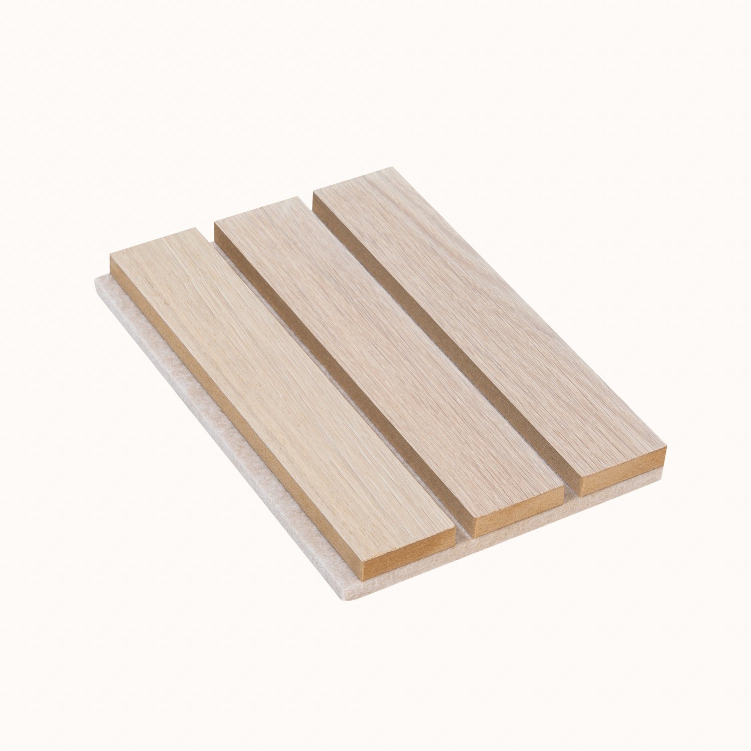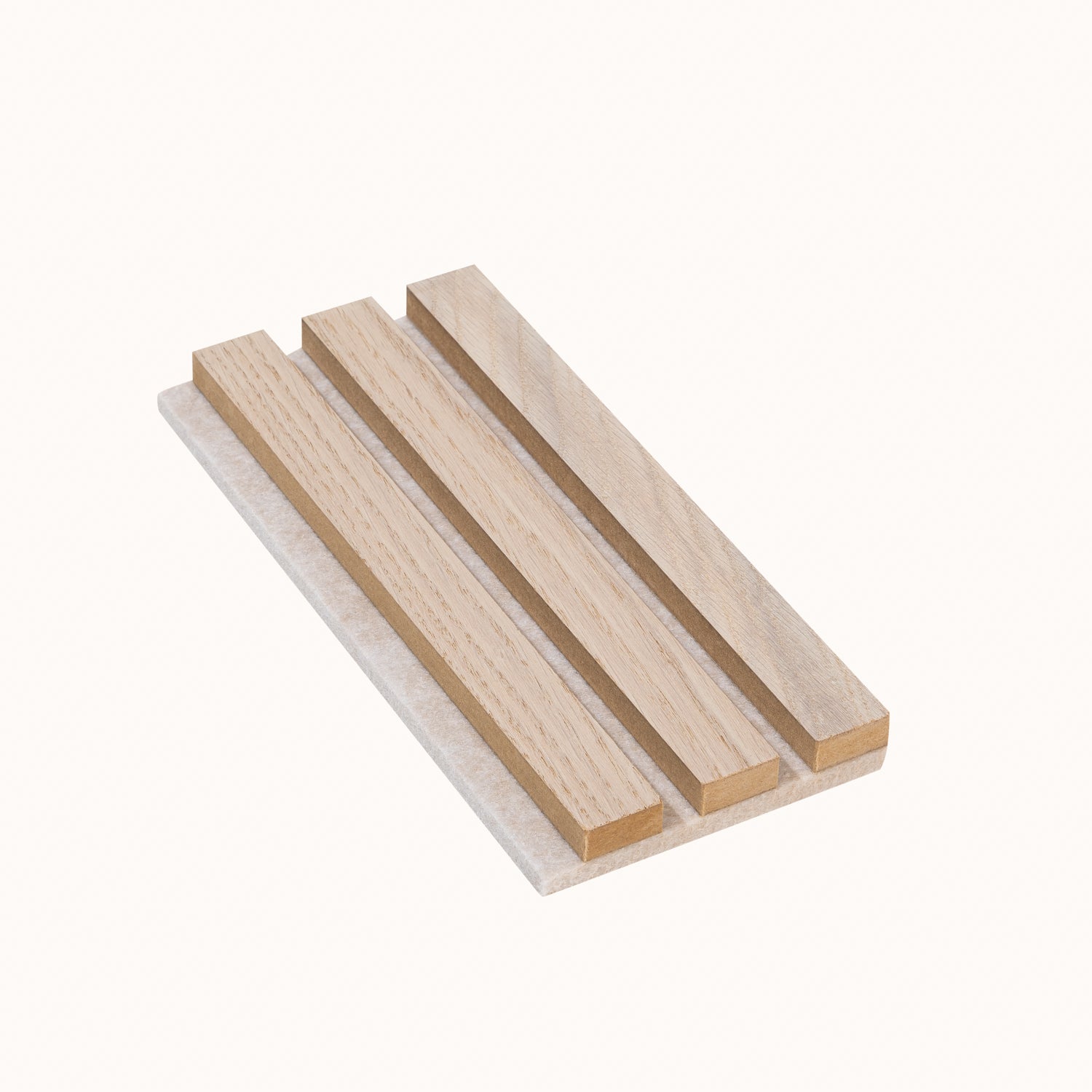 Acoustic Benefits: This SlatWall Acoustic sample is crafted by us at our Yorkshire workshop, ensuring a high-quality finish beyond compare. Each sample is assembled from MDF slats topped with a premium wood veneer, bonded to recycled felt with extra-strong adhesive. Our felt backing features acoustic properties and helps to reduce noise, enhancing your interior's acoustics.