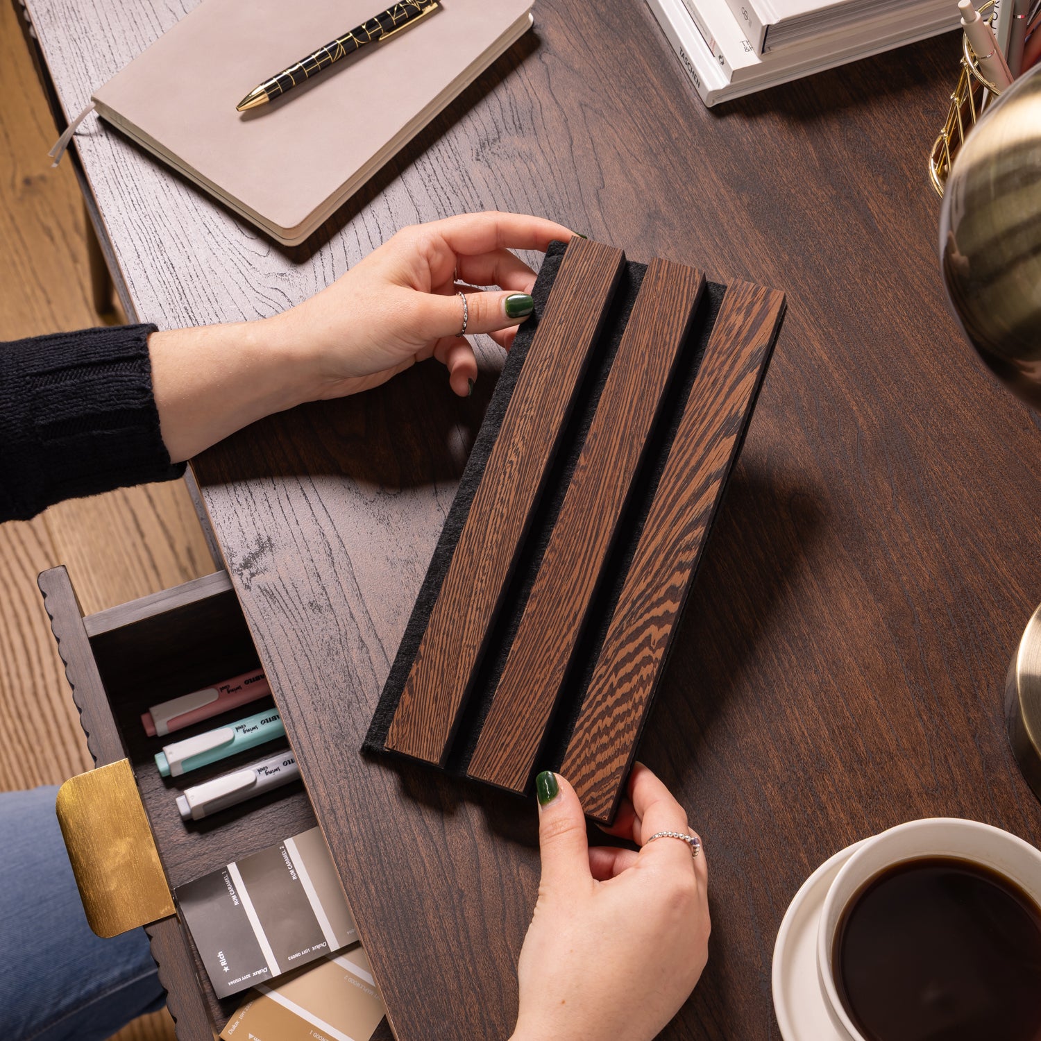 Grand slat width delivers a bolder, more premium aesthetic with wider slats, showcasing more wood and less felt for added texture and visual impact.