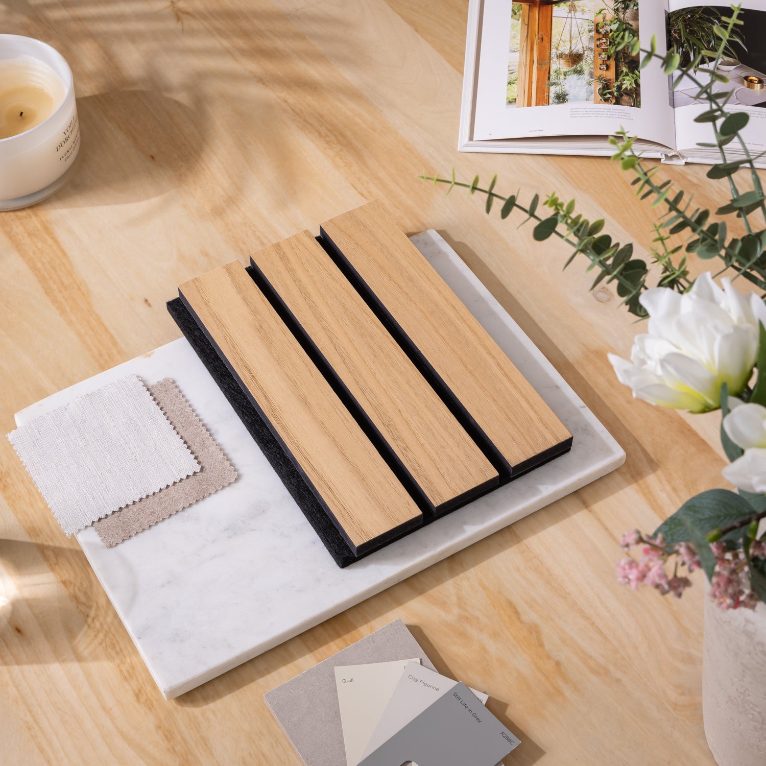 Grand slat width delivers a bolder, more premium aesthetic with wider slats, showcasing more wood and less felt for added texture and visual impact.