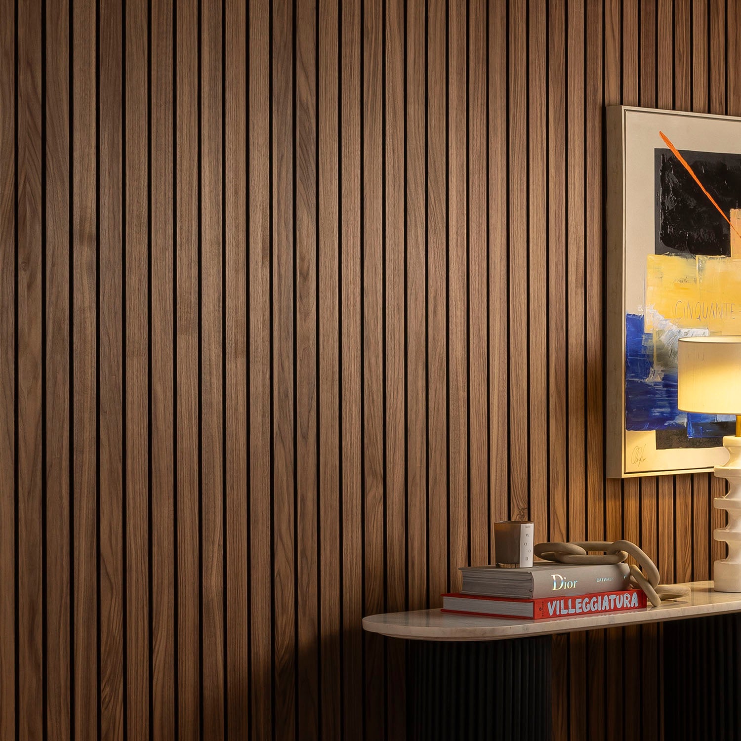 SlatWall Grand features wider slats and smaller gaps than SlatWall. This emphasizes the natural organic wood grain, introducing texture and warmth into a space.