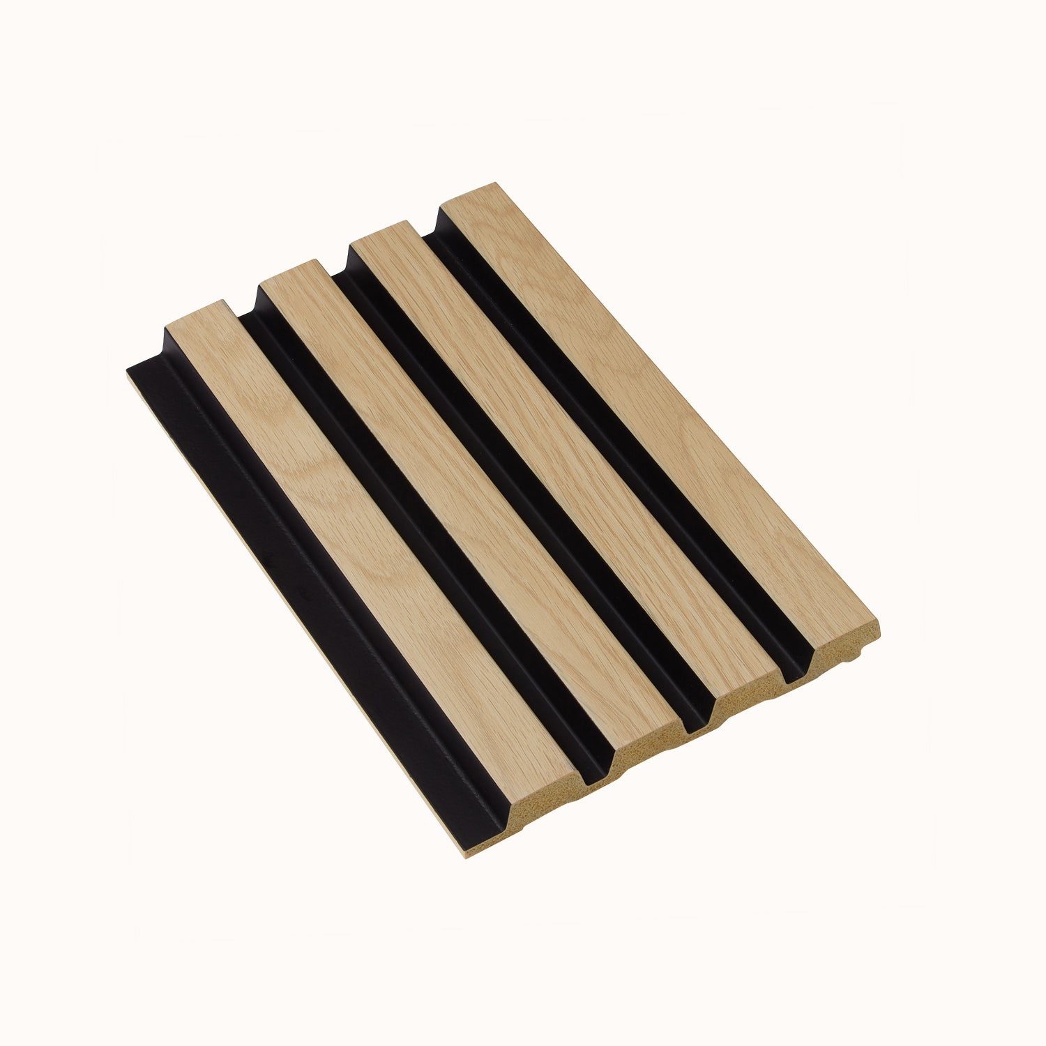 Intrigued by SlatWall Waterproof in Natural Oak and Black? Try this sample to help you decide the best option for your interior design. It showcases our signature slatted structure, waterproof finish and beautiful wood-like appearance. You can see the depth and contrast the black core provides and how it makes the oak wood effect stand out.