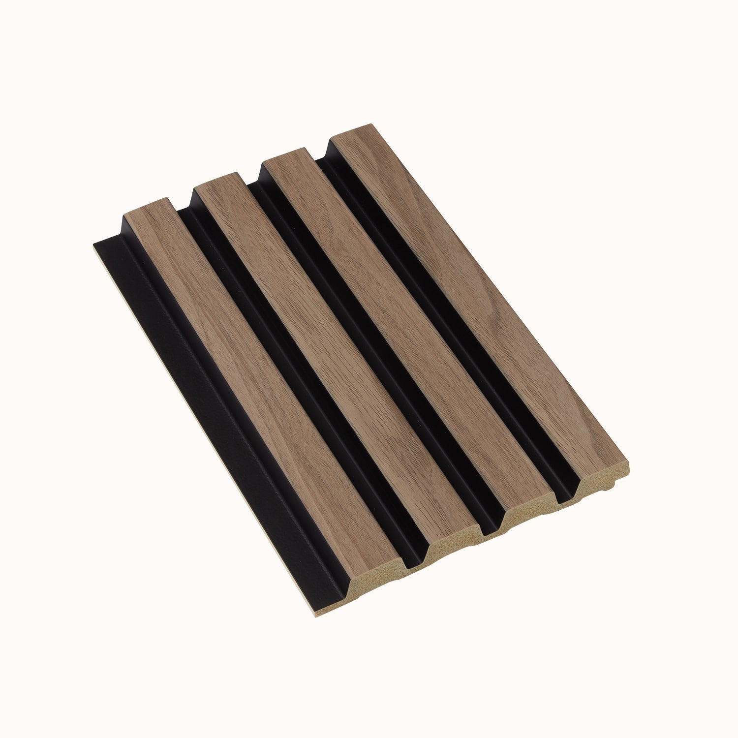 Discover how our SlatWall Waterproof panelling in Walnut and Black can introduce depth to your walls with this sample. This sample showcases warm wood-effect slats alternated with black edges, demonstrating how the colourway will bring a touch of drama to your interior. The contrasting core provides extra shadowing, making the walnut-style pattern stand out.